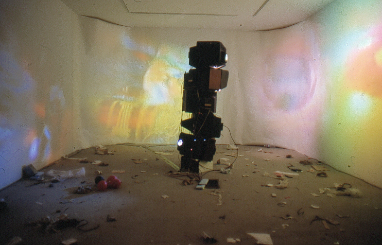 The viewer’s form is transposed on screen, appearing to be dragged through a shopping simulator “ride”. They are able to alter the sound and image with their movements. This navigable structure that the viewer faces is an iteration of interactive designs as something that limits personal options, while the engagement nonetheless still gives the participant a sense that they are determining their own course.