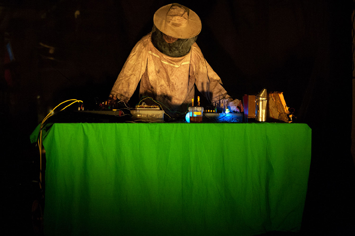 Dans sa pratique artistique, Bioni Samp mêle arts plastique et sonore, abeilles et technologie. Il a eu l’inspiration de mieux faire connaître la situation désespérée des abeilles après avoir été apiculteur à Londres. Pour capter les fréquences du son des abeilles, Samp a construit un équipement d’enregistrement sonore esthétiquement complexe qui inspire ses performances sonores, ses vidéos et ses photographies. Il crée de la musique électronique expérimentale, en direct et sur des enregistrements. Samp conçoit des logiciels et du matériel audio pour créer ses sons. Les mots sont bien faibles pour décrire son univers. Mieux vaut le voir en direct. À Ottawa, sa performance aura lieu dans le cadre de Nature Nocturne au Musée canadien de la nature, le 23 mai de 20 h à 23 h. Réservez vos billets sur : http://nature.ca/en/plan-your-visit/nature-nocturne/programme.