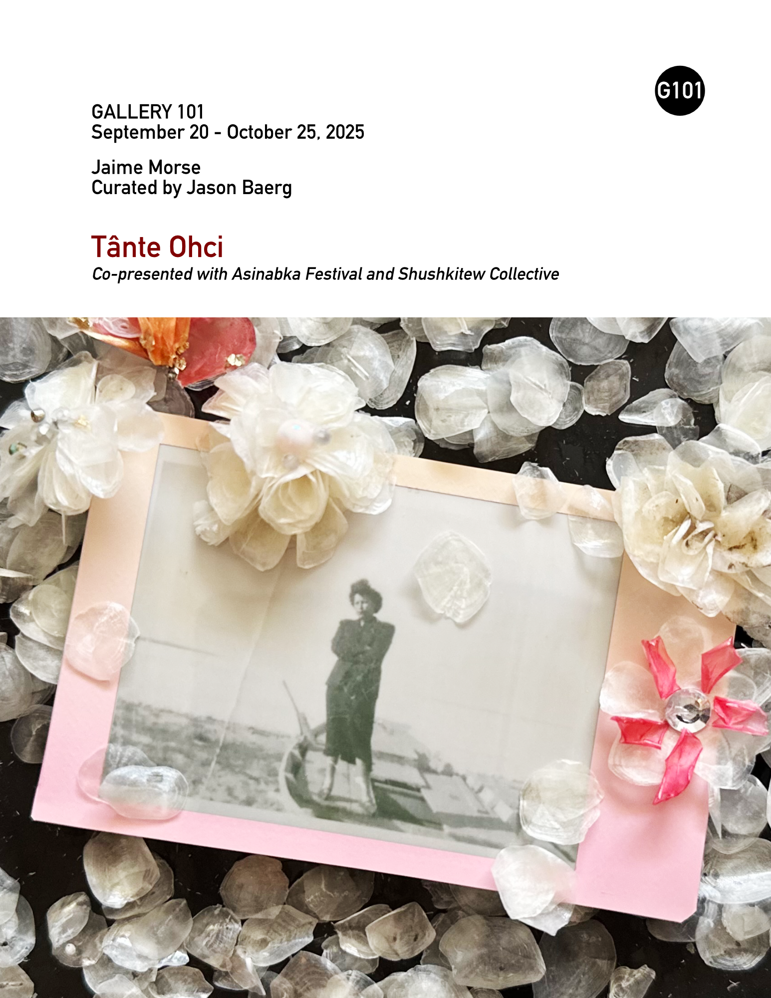 Jason Baerg, Jaime Morse AttachmentSize Tânte Ohci catalogue by artist Jaime Morse and curator Jason Baerg. Created in partnership with Shushkitew Collective6.88 MB Year of Publication: 2025Exhibition catalogue for Tânte Ohci by artist Jaime Morse, curated by Jason Baerg. Gallery 101 September 20- October 25, 2025 Design by Kristina Corre/ Gallery 101